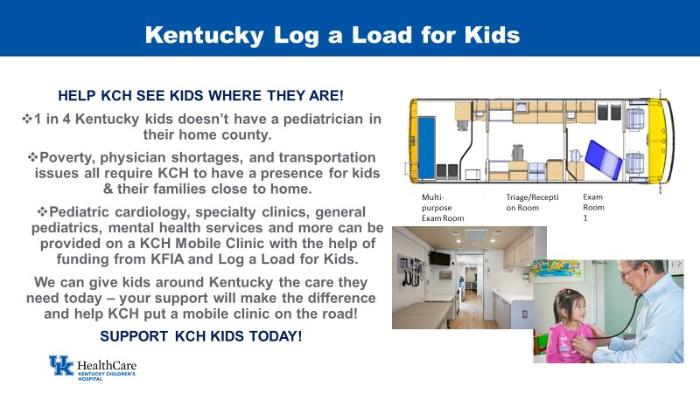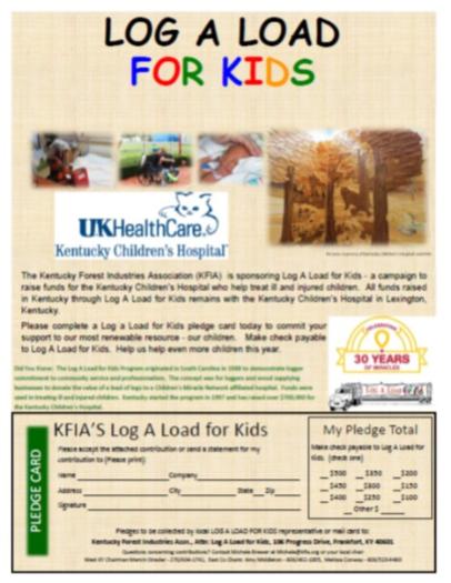 One Hundred Percent of the money raised by Kentucky Log a Load stays in Kentucky and benefits the Kentucky Children’s Hospital located in Lexington, KY. Kentucky has contributed over $750,000 to the children's hospital since the program started here in 1997.